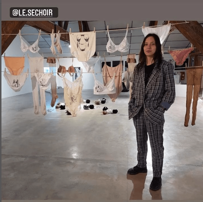 Ces sous-vêtements sont tous de seconde main et les dessins ont été réalisés d’après des photos de vendeuses érotiques et cam-girls trouvées sur un fameux site de culottes sales.